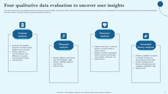 This slide covers types of qualitative analysis to reveal customer insights. The purpose of this slide is to increase the overall understanding of user characteristics. It consists of various processes such as content analysis, thematic analysis, narrative analysis and grounded theory analysis. Pitch your topic with ease and precision using this Four Qualitative Data Evaluation To Uncover User Insights Infographics Pdf This layout presents information on Content Analysis, Thematic Analysis, Narrative Analysis It is also available for immediate download and adjustment. So, changes can be made in the color, design, graphics or any other component to create a unique layout. This slide covers types of qualitative analysis to reveal customer insights. The purpose of this slide is to increase the overall understanding of user characteristics. It consists of various processes such as content analysis, thematic analysis, narrative analysis and grounded theory analysis.