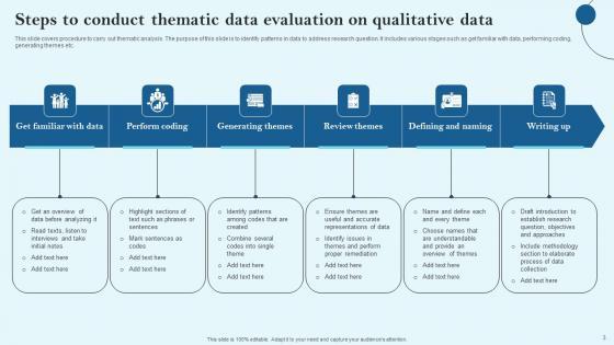 This slide covers procedure to carry out thematic analysis. The purpose of this slide is to identify patterns in data to address research question. It includes various stages such as get familiar with data, performing coding, generating themes etc. Pitch your topic with ease and precision using this Steps To Conduct Thematic Data Evaluation On Qualitative Data Themes Pdf This layout presents information on Perform Coding, Generating Themes, Review Themes It is also available for immediate download and adjustment. So, changes can be made in the color, design, graphics or any other component to create a unique layout. This slide covers procedure to carry out thematic analysis. The purpose of this slide is to identify patterns in data to address research question. It includes various stages such as get familiar with data, performing coding, generating themes etc.