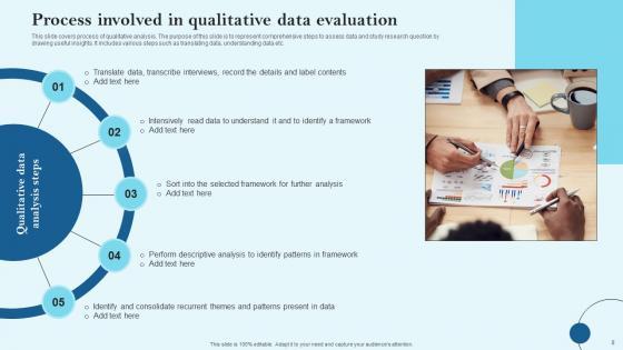 This slide covers process of qualitative analysis. The purpose of this slide is to represent comprehensive steps to assess data and study research question by drawing useful insights. It includes various steps such as translating data, understanding data etc. Pitch your topic with ease and precision using this Process Involved In Qualitative Data Evaluation Infographics Pdf This layout presents information on Qualitative Data, Analysis Steps, Framework It is also available for immediate download and adjustment. So, changes can be made in the color, design, graphics or any other component to create a unique layout. This slide covers process of qualitative analysis. The purpose of this slide is to represent comprehensive steps to assess data and study research question by drawing useful insights. It includes various steps such as translating data, understanding data etc.