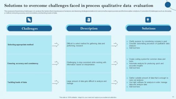 The purpose of examining challenges is to analyze the factors that impede pace of analysis and devising strategies solutions to overcome the repercussions and find innovative solutions. It consists of challenges such as choosing a method, ensuring accuracy and consistency and tackling loads of data. Showcasing this set of slides titled Solutions To Overcome Challenges Faced In Process Qualitative Data Evaluation Pictures Pdf The topics addressed in these templates are Selecting Appropriate, Tackling Loads Of Data, Data Evaluation All the content presented in this PPT design is completely editable. Download it and make adjustments in color, background, font etc. as per your unique business setting. The purpose of examining challenges is to analyze the factors that impede pace of analysis and devising strategies solutions to overcome the repercussions and find innovative solutions. It consists of challenges such as choosing a method, ensuring accuracy and consistency and tackling loads of data.