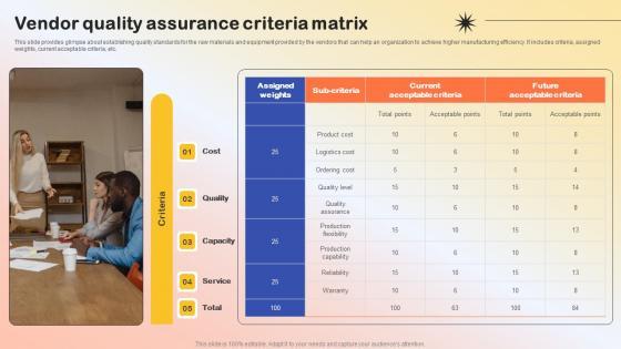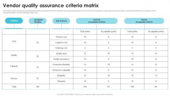 This slide provides glimpse about establishing quality standards for the raw materials and equipment provided by the vendors that can help an organization to achieve higher manufacturing efficiency. It includes criteria, assigned weights, current acceptable criteria, etc. The best PPT templates are a great way to save time, energy, and resources. Slidegeeks have 100 percent editable powerpoint slides making them incredibly versatile. With these quality presentation templates, you can create a captivating and memorable presentation by combining visually appealing slides and effectively communicating your message. Download Vendor Quality Assurance Criteria Matrix Topics PDF from Slidegeeks and deliver a wonderful presentation.