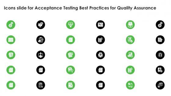 Coming up with a presentation necessitates that the majority of the effort goes into the content and the message you intend to convey. The visuals of a PowerPoint presentation can only be effective if it supplements and supports the story that is being told. Keeping this in mind our experts created Icons Slide For Acceptance Testing Best Practices For Quality Assurance PPT Example to reduce the time that goes into designing the presentation. This way, you can concentrate on the message while our designers take care of providing you with the right template for the situation. Our Icons Slide For Acceptance Testing Best Practices For Quality Assurance PPT Example are topically designed to provide an attractive backdrop to any subject. Use them to look like a presentation pro.