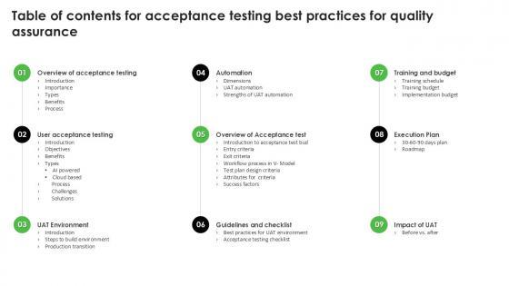 Create an editable Acceptance Testing Best Practices For Quality Assurance Table Of Contents PPT Sample that communicates your idea and engages your audience. Whether you are presenting a business or an educational presentation, pre designed presentation templates help save time. Acceptance Testing Best Practices For Quality Assurance Table Of Contents PPT Sample is highly customizable and very easy to edit, covering many different styles from creative to business presentations. Slidegeeks has creative team members who have crafted amazing templates. So, go and get them without any delay. Our Acceptance Testing Best Practices For Quality Assurance Table Of Contents PPT Sample are topically designed to provide an attractive backdrop to any subject. Use them to look like a presentation pro.