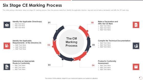 This slide portrays information about six stage CE marking process. Here the process starts from identify the applicable directive step and end at make a declaration and affix the CE mark step. This is a quality assurance templates set 1 six stage ce marking process ppt styles structure pdf template with various stages. Focus and dispense information on six stages using this creative set, that comes with editable features. It contains large content boxes to add your information on topics like products conformity assessment, compile the technical documentation, make a declaration and affix the ce mark, identify the applicable directive. You can also showcase facts, figures, and other relevant content using this PPT layout. Grab it now.