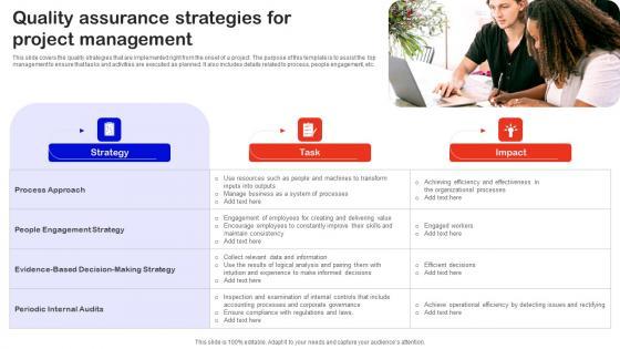 This slide covers the quality strategies that are implemented right from the onset of a project. The purpose of this template is to assist the top management to ensure that tasks and activities are executed as planned. It also includes details related to process, people engagement, etc. Showcasing this set of slides titled Quality Assurance Strategies For Project Management Structure Pdf. The topics addressed in these templates are Strategy, Task, Impact. All the content presented in this PPT design is completely editable. Download it and make adjustments in color, background, font etc. as per your unique business setting. This slide covers the quality strategies that are implemented right from the onset of a project. The purpose of this template is to assist the top management to ensure that tasks and activities are executed as planned. It also includes details related to process, people engagement, etc.