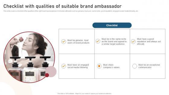 This slide covers a checklist of the qualities of the right brand spokesperson. It includes attributes such as genuine, loyal user, same niche, good reputation, engaged social media following, etc. Do you have to make sure that everyone on your team knows about any specific topic I yes, then you should give Checklist With Qualities Of Suitable Brand Techniques For Generating Brand Awareness Structure Pdf a try. Our experts have put a lot of knowledge and effort into creating this impeccable Checklist With Qualities Of Suitable Brand Techniques For Generating Brand Awareness Structure Pdf. You can use this template for your upcoming presentations, as the slides are perfect to represent even the tiniest detail. You can download these templates from the Slidegeeks website and these are easy to edit. So grab these today This slide covers a checklist of the qualities of the right brand spokesperson. It includes attributes such as genuine, loyal user, same niche, good reputation, engaged social media following, etc.