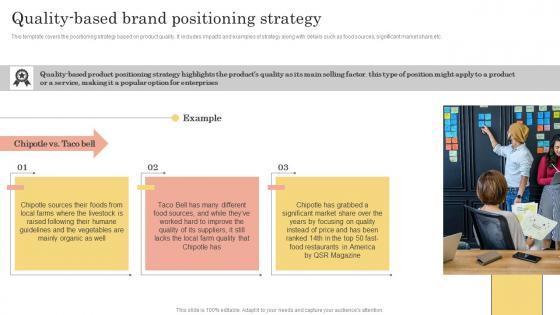 This slide covers the positioning strategy based on product quality. It includes impacts and examples of strategy along with details such as food sources, significant market share, etc.Do you know about Slidesgeeks Quality Based Product Positioning Strategy Comprehensive Guide On How To Successfully Graphics PDF These are perfect for delivering any kind od presentation. Using it, create PowerPoint presentations that communicate your ideas and engage audiences. Save time and effort by using our pre-designed presentation templates that are perfect for a wide range of topic. Our vast selection of designs covers a range of styles, from creative to business, and are all highly customizable and easy to edit. Download as a PowerPoint template or use them as Google Slides themes.