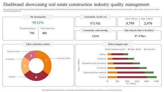 This slide showcases dashboard for building construction quality inspection which helps track project performance and make improvements. It provides information such as on site inspection, safety meeting, rework cost, time taken and client satisfaction etc. Pitch your topic with ease and precision using this Dashboard Showcasing Real Estate Construction Industry Quality Management Topics Pdf. This layout presents information on Client Satisfaction Statistics, Defect Categories Types. It is also available for immediate download and adjustment. So, changes can be made in the color, design, graphics or any other component to create a unique layout. This slide showcases dashboard for building construction quality inspection which helps track project performance and make improvements. It provides information such as on site inspection, safety meeting, rework cost, time taken and client satisfaction etc.
