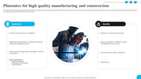 This slide describes the use of photonics technology in manufacturing and construction and the applications caters to cut and measure raw materials, drilling, welding, distance measurement, plastic management, photovoltaic cell manufacturing, and semiconductors used in medical. There are so many reasons you need a Fibers IT Photonics For High Quality Manufacturing And Construction. The first reason is you can not spend time making everything from scratch, Thus, Slidegeeks has made presentation templates for you too. You can easily download these templates from our website easily. This slide describes the use of photonics technology in manufacturing and construction and the applications caters to cut and measure raw materials, drilling, welding, distance measurement, plastic management, photovoltaic cell manufacturing, and semiconductors used in medical.