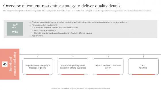 This slide provides insight into content marketing used to deliver quality content. It covers the purpose and benefits which are helps to convey the organizations message, increase conversions and create brand awareness.There are so many reasons you need a Overview Of Content Marketing Strategy To Deliver Quality Details Efficient Nonprofit Marketing. The first reason is you can not spend time making everything from scratch, Thus, Slidegeeks has made presentation templates for you too. You can easily download these templates from our website easily. This slide provides insight into content marketing used to deliver quality content. It covers the purpose and benefits which are helps to convey the organizations message, increase conversions and create brand awareness.