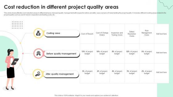 This slide shows effective cost reduction areas in different phases of project quality management with respect to before and after case scenario of implementing the project quality. It includes different costing areas related to the project quality such as cost of rework, inspection and testing costs, etc. Slidegeeks is here to make your presentations a breeze with Cost Reduction In Different Project Quality Areas Executing Quality Ppt Sample PM SS V With our easy-to-use and customizable templates, you can focus on delivering your ideas rather than worrying about formatting. With a variety of designs to choose from, you are sure to find one that suits your needs. And with animations and unique photos, illustrations, and fonts, you can make your presentation pop. So whether you are giving a sales pitch or presenting to the board, make sure to check out Slidegeeks first This slide shows effective cost reduction areas in different phases of project quality management with respect to before and after case scenario of implementing the project quality. It includes different costing areas related to the project quality such as cost of rework, inspection and testing costs, etc.