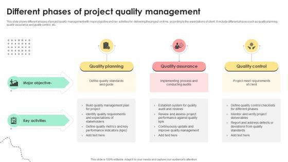 This slide shows different phases of project quality management with major objective and key activities for delivering the project on time, according to the expectations of client. It include different phases such as quality planning, quality assurance and quality control, etc. Slidegeeks is here to make your presentations a breeze with Administering Quality Assurance Different Phases Of Project Quality Management PM SS V With our easy-to-use and customizable templates, you can focus on delivering your ideas rather than worrying about formatting. With a variety of designs to choose from, you are sure to find one that suits your needs. And with animations and unique photos, illustrations, and fonts, you can make your presentation pop. So whether you are giving a sales pitch or presenting to the board, make sure to check out Slidegeeks first This slide shows different phases of project quality management with major objective and key activities for delivering the project on time, according to the expectations of client. It include different phases such as quality planning, quality assurance and quality control, etc.