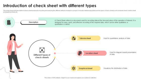 This slide shows brief description of check-sheet analysis for recording and analyzing the different defects included in a project. It includes detailed description and key types of check-sheets such as tabular sheet, location sheet and graphical sheet, etc. This Introduction Of Check Sheet With Different Executing Quality Ppt Sample PM SS V is perfect for any presentation, be it in front of clients or colleagues. It is a versatile and stylish solution for organizing your meetings. The Introduction Of Check Sheet With Different Executing Quality Ppt Sample PM SS V features a modern design for your presentation meetings. The adjustable and customizable slides provide unlimited possibilities for acing up your presentation. Slidegeeks has done all the homework before launching the product for you. So, do not wait, grab the presentation templates today This slide shows brief description of check-sheet analysis for recording and analyzing the different defects included in a project. It includes detailed description and key types of check-sheets such as tabular sheet, location sheet and graphical sheet, etc.