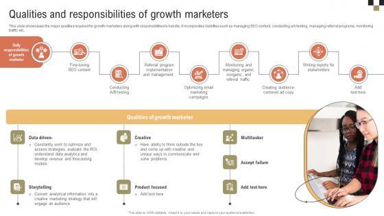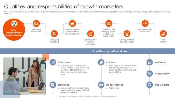 This slide showcases the major qualities required for growth marketers along with responsibilities to handle. It incorporates liabilities such as managing SEO content, conducting a or b testing, managing referral programs, monitoring traffic etc. Are you in need of a template that can accommodate all of your creative concepts This one is crafted professionally and can be altered to fit any style. Use it with Google Slides or PowerPoint. Include striking photographs, symbols, depictions, and other visuals. Fill, move around, or remove text boxes as desired. Test out color palettes and font mixtures. Edit and save your work, or work with colleagues. Download A Comprehensive Guide On Growth Qualities And Responsibilities Of Growth Marketers MKT SS V and observe how to make your presentation outstanding. Give an impeccable presentation to your group and make your presentation unforgettable. This slide showcases the major qualities required for growth marketers along with responsibilities to handle. It incorporates liabilities such as managing SEO content, conducting a or b testing, managing referral programs, monitoring traffic etc.