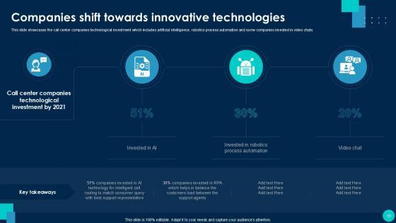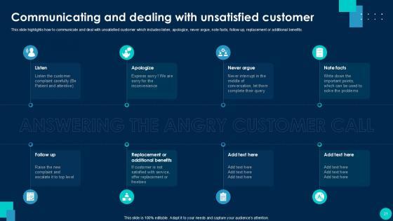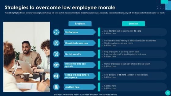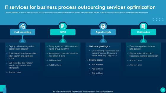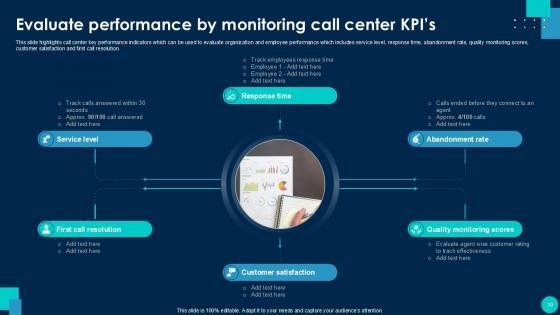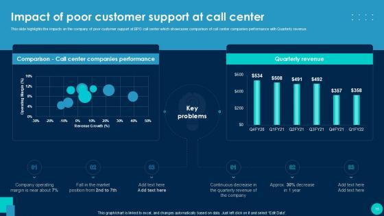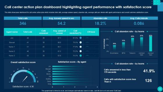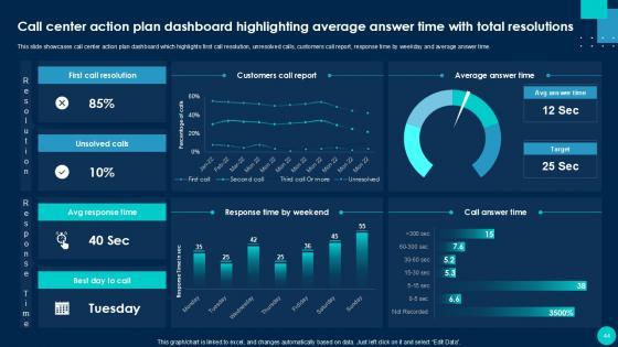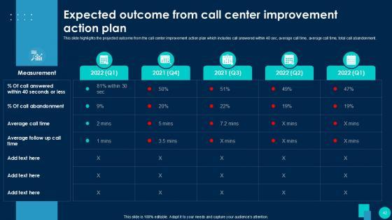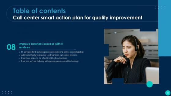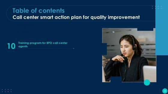 Using this ready-made PowerPoint slide, you can incorporate your own data to make an impact with your business innovation and clarity of goals. Use this brilliantly designed Call Center Smart Action Plan For Quality Improvement Powerpoint Presentation Slides to showcase how ultimately all business concepts are related. This presentation template can also be used to record resource allocation in a visual form. The Call Center Performance Improvement Plan, Performance Management, Measuring Call Center Performance-Slide Call Center Smart Action Plan For Quality Improvement Powerpoint Presentation Slides is suitable for all your business needs, where you need to make sure that all bases are covered. Download this PPT template now to start a journey on your chosen business, with customer satisfaction the key aim. Our Call Center Smart Action Plan for Quality Improvement template provides a detailed overview of the companys background, global presence, and organizational structure. It highlights the challenges faced by the BPO center and their solutions, including inbound and outbound call volume rates. The template also covers technological advancements, strategies for improvement, and customer service guidelines, such as handling complaints and telephone etiquette. Additionally, it presents methods to enhance business processes with IT services and outlines expected growth through performance indicators and dashboards.