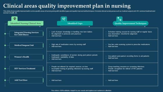 This slide shows quality improvement in some specific areas of nursing along with identified gaps and quality improvement techniques. It include clinical nursing areas such as medical surgeon unit, HIV services treatment and womens health, etc. Showcasing this set of slides titled Clinical Areas Quality Improvement Plan In Nursing Slides Pdf. The topics addressed in these templates are Clinical Area, Identified Gaps, Quality Improvement Techniques. All the content presented in this PPT design is completely editable. Download it and make adjustments in color, background, font etc. as per your unique business setting. This slide shows quality improvement in some specific areas of nursing along with identified gaps and quality improvement techniques. It include clinical nursing areas such as medical surgeon unit, HIV services treatment and womens health, etc.