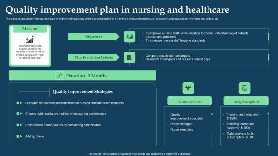 This slide shows quality improvement plan for implementing nursing strategies with timeline of 3 months. It include elements such as mission, objectives, team members and budget, etc. Pitch your topic with ease and precision using this Quality Improvement Plan In Nursing And Healthcare Mockup Pdf. This layout presents information on Team Members, Budget Required. It is also available for immediate download and adjustment. So, changes can be made in the color, design, graphics or any other component to create a unique layout. This slide shows quality improvement plan for implementing nursing strategies with timeline of 3 months. It include elements such as mission, objectives, team members and budget, etc.