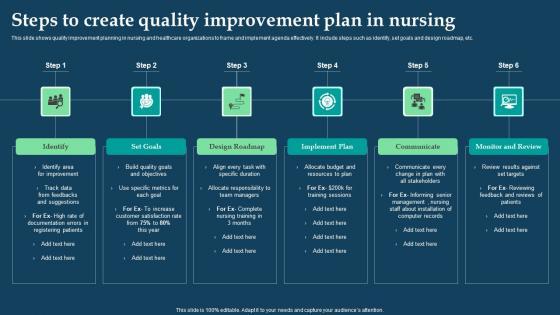 This slide shows quality improvement planning in nursing and healthcare organizations to frame and implement agenda effectively. It include steps such as identify, set goals and design roadmap, etc. Showcasing this set of slides titled Steps To Create Quality Improvement Plan In Nursing Topics Pdf. The topics addressed in these templates are Identify, Set Goals, Design Roadmap, Implement Plan. All the content presented in this PPT design is completely editable. Download it and make adjustments in color, background, font etc. as per your unique business setting. This slide shows quality improvement planning in nursing and healthcare organizations to frame and implement agenda effectively. It include steps such as identify, set goals and design roadmap, etc.