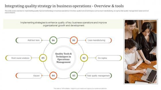 This slide covers overview to implementing quality improvement strategy in business operations. It involves quality tools and techniques such as lean manufacturing, six sigma, total quality management, kaizen and root cause analysis. The Integrating Quality Strategy In Executing Effective Quality Enhancement Ideas Pdf is a compilation of the most recent design trends as a series of slides. It is suitable for any subject or industry presentation, containing attractive visuals and photo spots for businesses to clearly express their messages. This template contains a variety of slides for the user to input data, such as structures to contrast two elements, bullet points, and slides for written information. Slidegeeks is prepared to create an impression. This slide covers overview to implementing quality improvement strategy in business operations. It involves quality tools and techniques such as lean manufacturing, six sigma, total quality management, kaizen and root cause analysis.