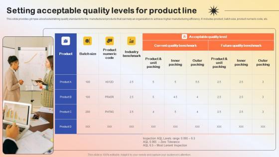 This slide provides glimpse about establishing quality standards for the manufactured products that can help an organization to achieve higher manufacturing efficiency. It includes product, batch size, product numeric code, etc. This modern and well-arranged Setting Acceptable Quality Levels For Product Line Streamlining Production Operational Structure PDF provides lots of creative possibilities. It is very simple to customize and edit with the Powerpoint Software. Just drag and drop your pictures into the shapes. All facets of this template can be edited with Powerpoint, no extra software is necessary. Add your own material, put your images in the places assigned for them, adjust the colors, and then you can show your slides to the world, with an animated slide included. This slide provides glimpse about establishing quality standards for the manufactured products that can help an organization to achieve higher manufacturing efficiency. It includes product, batch size, product numeric code, etc.