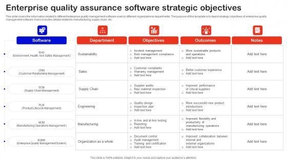This slide covers the information related to different enterprise quality management software used by different organizational departments. The purpose of this template is to depict strategic objectives of enterprise quality management software. It also includes details related to manufacturing, supply chain, etc. Pitch your topic with ease and precision using this Enterprise Quality Assurance Software Strategic Objectives Rules Pdf. This layout presents information on Department, Objectives, Outcomes. It is also available for immediate download and adjustment. So, changes can be made in the color, design, graphics or any other component to create a unique layout. This slide covers the information related to different enterprise quality management software used by different organizational departments. The purpose of this template is to depict strategic objectives of enterprise quality management software. It also includes details related to manufacturing, supply chain, etc.