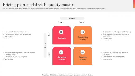 This slide showcase quality pricing strategies for entering into new market with product specification. It includes penetration pricing, premium pricing, skimming pricing and economic. Showcasing this set of slides titled Pricing Plan Model With Quality Matrix Diagrams Pdf. The topics addressed in these templates are Quality Pricing Strategies, Product Specification, Penetration Pricing, Premium Pricin. All the content presented in this PPT design is completely editable. Download it and make adjustments in color, background, font etc. as per your unique business setting. This slide showcase quality pricing strategies for entering into new market with product specification. It includes penetration pricing, premium pricing, skimming pricing and economic.