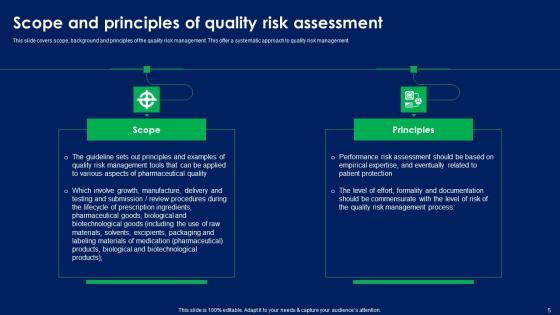 This slide covers scope, background and principles of the quality risk management. This offer a systematic approach to quality risk management. Are you searching for a Risk Tolerance Capacity Quality Risk Assessment Introduction PDF that is uncluttered, straightforward, and original Its easy to edit, and you can change the colors to suit your personal or business branding. For a presentation that expresses how much effort you have put in, this template is ideal With all of its features, including tables, diagrams, statistics, and lists, its perfect for a business plan presentation. Make your ideas more appealing with these professional slides. Download Risk Tolerance Capacity Quality Risk Assessment Introduction PDF from Slidegeeks today. This slide covers scope, background and principles of the quality risk management. This offer a systematic approach to quality risk management.