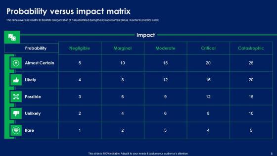Presenting this set of slides with name project quality management plan risk assessment matrix ppt show outline pdf. This is a eight stage process. The stages in this process are risk assessment matrix. This is a completely editable PowerPoint presentation and is available for immediate download. Download now and impress your audience.