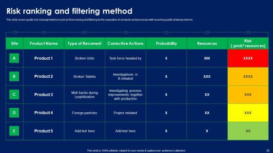 This slide covers quality risk management tool such as Risk ranking and filtering for the evaluation of products and processes with recurring quality related problems. Retrieve professionally designed Quality Assessment Risk Ranking And Filtering Method Template PDF to effectively convey your message and captivate your listeners. Save time by selecting pre made slideshows that are appropriate for various topics, from business to educational purposes. These themes come in many different styles, from creative to corporate, and all of them are easily adjustable and can be edited quickly. Access them as PowerPoint templates or as Google Slides themes. You do not have to go on a hunt for the perfect presentation because Slidegeeks got you covered from everywhere.