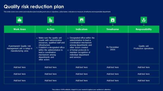 This slide covers risk control and reduction plan including work area or objectives, action taken, indicators to measure, timeframe and responsible department. Explore a selection of the finest Quality Assessment Quality Risk Reduction Plan Sample PDF here. With a plethora of professionally designed and pre made slide templates, you can quickly and easily find the right one for your upcoming presentation. You can use our Quality Assessment Quality Risk Reduction Plan Sample PDF to effectively convey your message to a wider audience. Slidegeeks has done a lot of research before preparing these presentation templates. The content can be personalized and the slides are highly editable. Grab templates today from Slidegeeks.