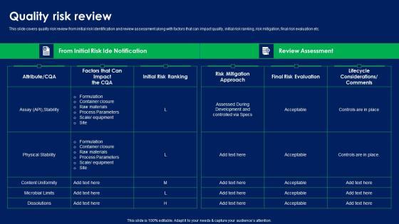This slide covers quality risk review from initial risk identification and review assessment along with factors that can impact quality, initial risk ranking, risk mitigation, final risk evaluation etc. Welcome to our selection of the Quality Risk Review Quality Risk Assessment Slides PDF These are designed to help you showcase your creativity and bring your sphere to life. Planning and Innovation are essential for any business that is just starting out. This collection contains the designs that you need for your everyday presentations. All of our PowerPoints are 100 percent editable, so you can customize them to suit your needs. This multi-purpose template can be used in various situations. Grab these presentation templates today This slide covers quality risk review from initial risk identification and review assessment along with factors that can impact quality, initial risk ranking, risk mitigation, final risk evaluation etc.