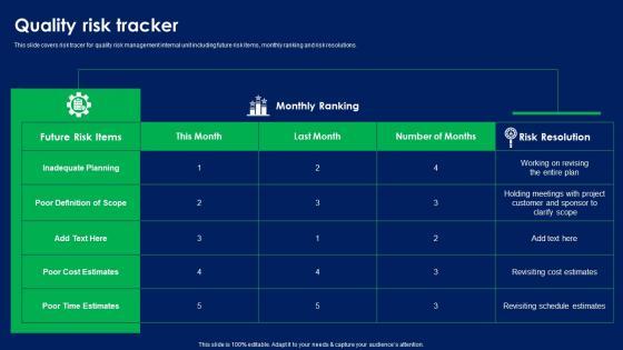 This slide covers risk tracer for quality risk management internal unit including future risk items, monthly ranking and risk resolutions. The Quality Assessment Quality Risk Tracker Rules PDF is a compilation of the most recent design trends as a series of slides. It is suitable for any subject or industry presentation, containing attractive visuals and photo spots for businesses to clearly express their messages. This template contains a variety of slides for the user to input data, such as structures to contrast two elements, bullet points, and slides for written information. Slidegeeks is prepared to create an impression.