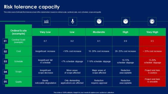 This slide covers Estimate Risk tolerance level of the stakeholders based on ordinal scale, cardinal scale, cost, schedule, scope and quality. Slidegeeks has constructed Quality Assessment Risk Tolerance Capacity Topics PDF after conducting extensive research and examination. These presentation templates are constantly being generated and modified based on user preferences and critiques from editors. Here, you will find the most attractive templates for a range of purposes while taking into account ratings and remarks from users regarding the content. This is an excellent jumping off point to explore our content and will give new users an insight into our top notch PowerPoint Templates.