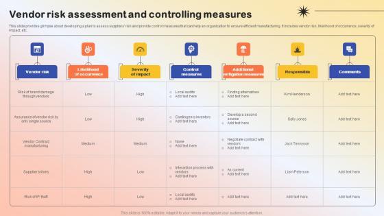 This slide provides glimpse about developing a plan to assess suppliers risk and provide control measures that can help an organization to ensure efficient manufacturing. It includes vendor risk, likelihood of occurrence, severity of impact, etc.Retrieve professionally designed Vendor Risk Assessment And Controlling Production Quality Administration Icons Pdf to effectively convey your message and captivate your listeners. Save time by selecting pre-made slideshows that are appropriate for various topics, from business to educational purposes. These themes come in many different styles, from creative to corporate, and all of them are easily adjustable and can be edited quickly. Access them as PowerPoint templates or as Google Slides themes. You do not have to go on a hunt for the perfect presentation because Slidegeeks got you covered from everywhere. This slide provides glimpse about developing a plan to assess suppliers risk and provide control measures that can help an organization to ensure efficient manufacturing. It includes vendor risk, likelihood of occurrence, severity of impact, etc.