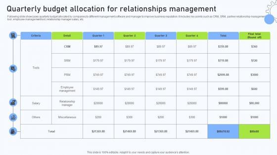 Following slide showcases quarterly budget allocated by companies to different management software and manager to improve business reputation. It includes key points such as CRM, SRM, partner relationship management tool, employee management tool, relationship manager salary, etc. Here you can discover an assortment of the finest PowerPoint and Google Slides templates. With these templates, you can create presentations for a variety of purposes while simultaneously providing your audience with an eye-catching visual experience. Download Relationship Management Automation Quarterly Budget Allocation For Relationships to deliver an impeccable presentation. These templates will make your job of preparing presentations much quicker, yet still, maintain a high level of quality. Slidegeeks has experienced researchers who prepare these templates and write high-quality content for you. Later on, you can personalize the content by editing the Relationship Management Automation Quarterly Budget Allocation For Relationships. Following slide showcases quarterly budget allocated by companies to different management software and manager to improve business reputation. It includes key points such as CRM, SRM, partner relationship management tool, employee management tool, relationship manager salary, etc.
