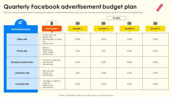 This slides showcases quarterly Facebook advertisement budget plan. It includes advertisements such as, video ads, image ads, dynamic product ads, lead form ads and carousel advertisements.Take your projects to the next level with our ultimate collection of Quarterly Facebook Advertisement Budget Plan Regional Marketing Plan To Boost Sales MKT SS. Slidegeeks has designed a range of layouts that are perfect for representing task or activity duration, keeping track of all your deadlines at a glance. Tailor these designs to your exact needs and give them a truly corporate look with your own brand colors they will make your projects stand out from the rest This slides showcases quarterly Facebook advertisement budget plan. It includes advertisements such as, video ads, image ads, dynamic product ads, lead form ads and carousel advertisements.
