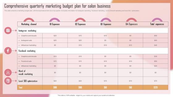 This slide presents a marketing budget plan with the expenses broken down by quarter. It includes information for Instagram marketing, Facebook marketing, word-of-mouth marketing and local SEO optimization. Take your projects to the next level with our ultimate collection of Customizing The Salon Experience Comprehensive Quarterly Marketing Budget Plan Strategy SS V. Slidegeeks has designed a range of layouts that are perfect for representing task or activity duration, keeping track of all your deadlines at a glance. Tailor these designs to your exact needs and give them a truly corporate look with your own brand colors they will make your projects stand out from the rest This slide presents a marketing budget plan with the expenses broken down by quarter. It includes information for Instagram marketing, Facebook marketing, word-of-mouth marketing and local SEO optimization.
