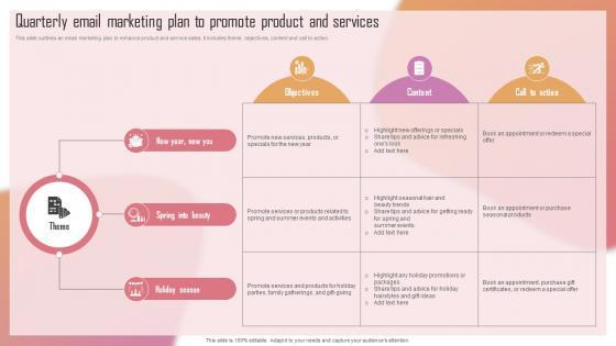 This slide outlines an email marketing plan to enhance product and service sales. It includes theme, objectives, content and call to action. Make sure to capture your audiences attention in your business displays with our gratis customizable Customizing The Salon Experience Quarterly Email Marketing Plan To Promote Product Strategy SS V. These are great for business strategies, office conferences, capital raising or task suggestions. If you desire to acquire more customers for your tech business and ensure they stay satisfied, create your own sales presentation with these plain slides. This slide outlines an email marketing plan to enhance product and service sales. It includes theme, objectives, content and call to action.