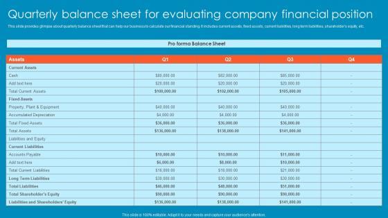 This slide provides glimpse about quarterly balance sheet that can help our business to calculate our financial standing. It includes current assets, fixed assets, current liabilities, long term liabilities, shareholders equity, etc.Take your projects to the next level with our ultimate collection of Quarterly Balance Sheet For Evaluating Company Guide To Corporate Financial Growth Plan Slides Pdf. Slidegeeks has designed a range of layouts that are perfect for representing task or activity duration, keeping track of all your deadlines at a glance. Tailor these designs to your exact needs and give them a truly corporate look with your own brand colors they all make your projects stand out from the rest. This slide provides glimpse about quarterly balance sheet that can help our business to calculate our financial standing. It includes current assets, fixed assets, current liabilities, long term liabilities, shareholders equity, etc.