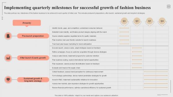 The slide portrays key milestones of the fashion business to be achieved in each quarter of initial year. This includes prelaunch preparations, after launch, sustained growth and long-term strategies. Explore a selection of the finest Implementing Quarterly Milestones For Successful Growth Fashion Startup Roadmap Plan Ppt Slide BP SS V here. With a plethora of professionally designed and pre-made slide templates, you can quickly and easily find the right one for your upcoming presentation. You can use our Implementing Quarterly Milestones For Successful Growth Fashion Startup Roadmap Plan Ppt Slide BP SS V to effectively convey your message to a wider audience. Slidegeeks has done a lot of research before preparing these presentation templates. The content can be personalized and the slides are highly editable. Grab templates today from Slidegeeks. The slide portrays key milestones of the fashion business to be achieved in each quarter of initial year. This includes prelaunch preparations, after launch, sustained growth and long-term strategies.