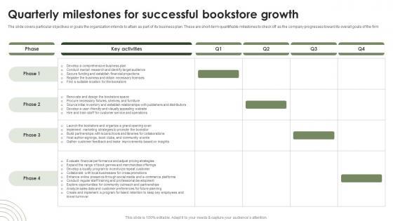 The slide covers particular objectives or goals the organization intends to attain as part of its business plan. These are short-term quantifiable milestones to check off as the company progresses toward its overall goals of the firm. Presenting this PowerPoint presentation, titled Online Bookstore Business Plan Quarterly Milestones For Successful Bookstore Growth BP SS V, with topics curated by our researchers after extensive research. This editable presentation is available for immediate download and provides attractive features when used. Download now and captivate your audience. Presenting this Online Bookstore Business Plan Quarterly Milestones For Successful Bookstore Growth BP SS V. Our researchers have carefully researched and created these slides with all aspects taken into consideration. This is a completely customizable Online Bookstore Business Plan Quarterly Milestones For Successful Bookstore Growth BP SS V that is available for immediate downloading. Download now and make an impact on your audience. Highlight the attractive features available with our PPTs. The slide covers particular objectives or goals the organization intends to attain as part of its business plan. These are short-term quantifiable milestones to check off as the company progresses toward its overall goals of the firm.