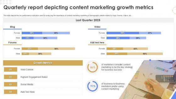 This slide depicts the key performance indicators used for analyzing the importance of content marketing consisting of demographic details related to blogs, forums, videos, etc. Slidegeeks is here to make your presentations a breeze with Quarterly Report Depicting Content Marketing Growth Metrics Quarterly Report Ppt Example With our easy-to-use and customizable templates, you can focus on delivering your ideas rather than worrying about formatting. With a variety of designs to choose from, you are sure to find one that suits your needs. And with animations and unique photos, illustrations, and fonts, you can make your presentation pop. So whether you are giving a sales pitch or presenting to the board, make sure to check out Slidegeeks first This slide depicts the key performance indicators used for analyzing the importance of content marketing consisting of demographic details related to blogs, forums, videos, etc.