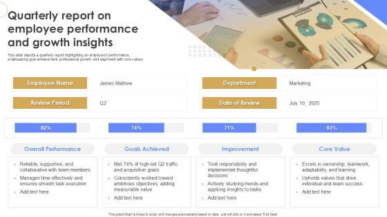 This slide depicts a quarterly report highlighting an employees performance, emphasizing goal achievement, professional growth, and alignment with core values. Find highly impressive Quarterly Report On Employee Performance And Growth Insights Quarterly Report Ppt Example on Slidegeeks to deliver a meaningful presentation. You can save an ample amount of time using these presentation templates. No need to worry to prepare everything from scratch because Slidegeeks experts have already done a huge research and work for you. You need to download Quarterly Report On Employee Performance And Growth Insights Quarterly Report Ppt Example for your upcoming presentation. All the presentation templates are 100 percent editable and you can change the color and personalize the content accordingly. Download now This slide depicts a quarterly report highlighting an employees performance, emphasizing goal achievement, professional growth, and alignment with core values.