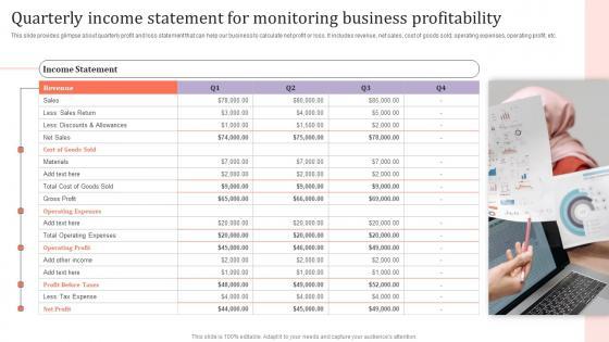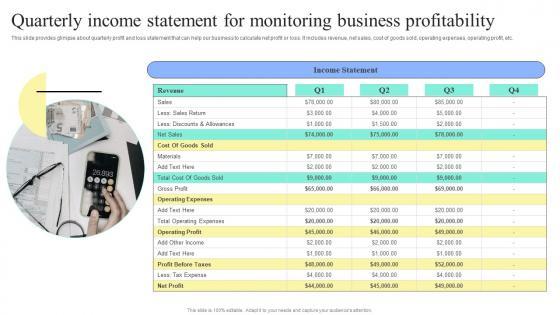 This slide provides glimpse about quarterly profit and loss statement that can help our business to calculate net profit or loss. It includes revenue, net sales, cost of goods sold, operating expenses, operating profit, etc.Welcome to our selection of the Quarterly Income Statement For Monitoring Business Profitability Effective Planning For Monetary Formats PDF. These are designed to help you showcase your creativity and bring your sphere to life. Planning and Innovation are essential for any business that is just starting out. This collection contains the designs that you need for your everyday presentations. All of our PowerPoints are 100 precent editable, so you can customize them to suit your needs. This multi-purpose template can be used in various situations. Grab these presentation templates today.