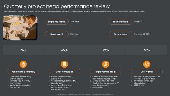 This slide shows quarterly review of project head to evaluate overall performance of candidate for improvements. It include performance summary, goals achieved, improvement areas and core values. Find highly impressive Quarterly Project Head Performance Review PPT Presentation SS on Slidegeeks to deliver a meaningful presentation. You can save an ample amount of time using these presentation templates. No need to worry to prepare everything from scratch because Slidegeeks experts have already done a huge research and work for you. You need to download Quarterly Project Head Performance Review PPT Presentation SS for your upcoming presentation. All the presentation templates are 100 percent editable and you can change the color and personalize the content accordingly. Download now This slide shows quarterly review of project head to evaluate overall performance of candidate for improvements. It include performance summary, goals achieved, improvement areas and core values.