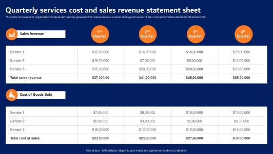 This slide can be used by organizations to represent revenue generated from sales of various services during each quarter. It also covers information about cost of services sold. The Service Promotion Plan Quarterly Services Cost And Sales Revenue Statement Demonstration PDF is a compilation of the most recent design trends as a series of slides. It is suitable for any subject or industry presentation, containing attractive visuals and photo spots for businesses to clearly express their messages. This template contains a variety of slides for the user to input data, such as structures to contrast two elements, bullet points, and slides for written information. Slidegeeks is prepared to create an impression.