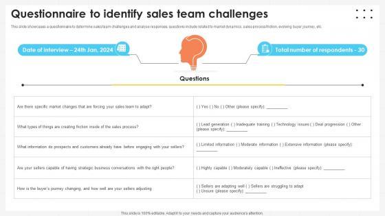 This slide showcases a questionnaire to determine sales team challenges and analyse responses, questions include related to market dynamics, sales process friction, evolving buyer journey, etc. This Business Development Team Questionnaire To Identify Sales Team Challenges SA SS V from Slidegeeks makes it easy to present information on your topic with precision. It provides customization options, so you can make changes to the colors, design, graphics, or any other component to create a unique layout. It is also available for immediate download, so you can begin using it right away. Slidegeeks has done good research to ensure that you have everything you need to make your presentation stand out. Make a name out there for a brilliant performance. This slide showcases a questionnaire to determine sales team challenges and analyse responses, questions include related to market dynamics, sales process friction, evolving buyer journey, etc.