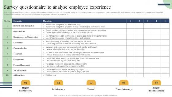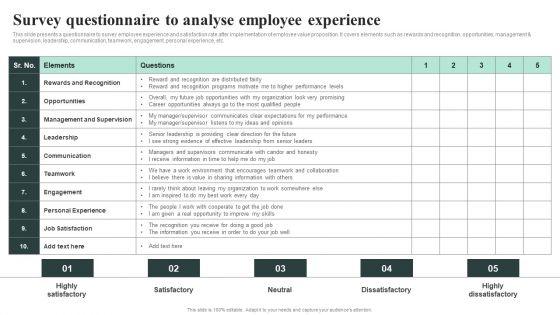 This slide presents a questionnaire to survey employee experience and satisfaction rate after implementation of employee value proposition. It covers elements such as rewards and recognition, opportunities, management and supervision, leadership, communication, teamwork, engagement, personal experience, etc. Create an editable Survey Questionnaire To Analyse Employee Experience Template PDF that communicates your idea and engages your audience. Whether youre presenting a business or an educational presentation, pre designed presentation templates help save time. Survey Questionnaire To Analyse Employee Experience Template PDF is highly customizable and very easy to edit, covering many different styles from creative to business presentations. Slidegeeks has creative team members who have crafted amazing templates. So, go and get them without any delay.