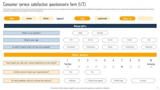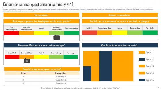 Boost your confidence and team morale with this well-structured Consumer Service Questionnaire Ppt Powerpoint Presentation Complete Deck With Slides Survey. This prefabricated set gives a voice to your presentation because of its well-researched content and graphics. Our experts have added all the components very carefully, thus helping you deliver great presentations with a single click. Not only that, it contains a set of six slides that are designed using the right visuals, graphics, etc. Various topics can be discussed, and effective brainstorming sessions can be conducted using the wide variety of slides added in this complete deck. Apart from this, our PPT design contains clear instructions to help you restructure your presentations and create multiple variations. The color, format, design anything can be modified as deemed fit by the user. Not only this, it is available for immediate download. So, grab it now. Our Consumer Service Questionnaire Ppt Powerpoint Presentation Complete Deck With Slides Survey are topically designed to provide an attractive backdrop to any subject. Use them to look like a presentation pro.