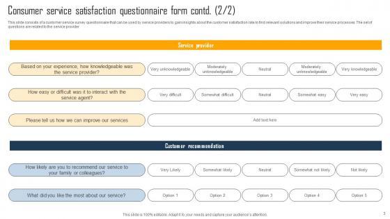 The purpose of this slide is to summarize the results customer service survey that can be used by service providers to gain insights about the customer satisfaction rate to find relevant solutions. Results provided are related to service provider and customer recommendation.Showcasing this set of slides titled Consumer Service Questionnaire Summary Survey SS The topics addressed in these templates are Moderately Unknowledgeable, Recommend Service, Experience Knowledgeable All the content presented in this PPT design is completely editable. Download it and make adjustments in color, background, font etc. as per your unique business setting. The purpose of this slide is to summarize the results customer service survey that can be used by service providers to gain insights about the customer satisfaction rate to find relevant solutions. Results provided are related to service provider and customer recommendation.